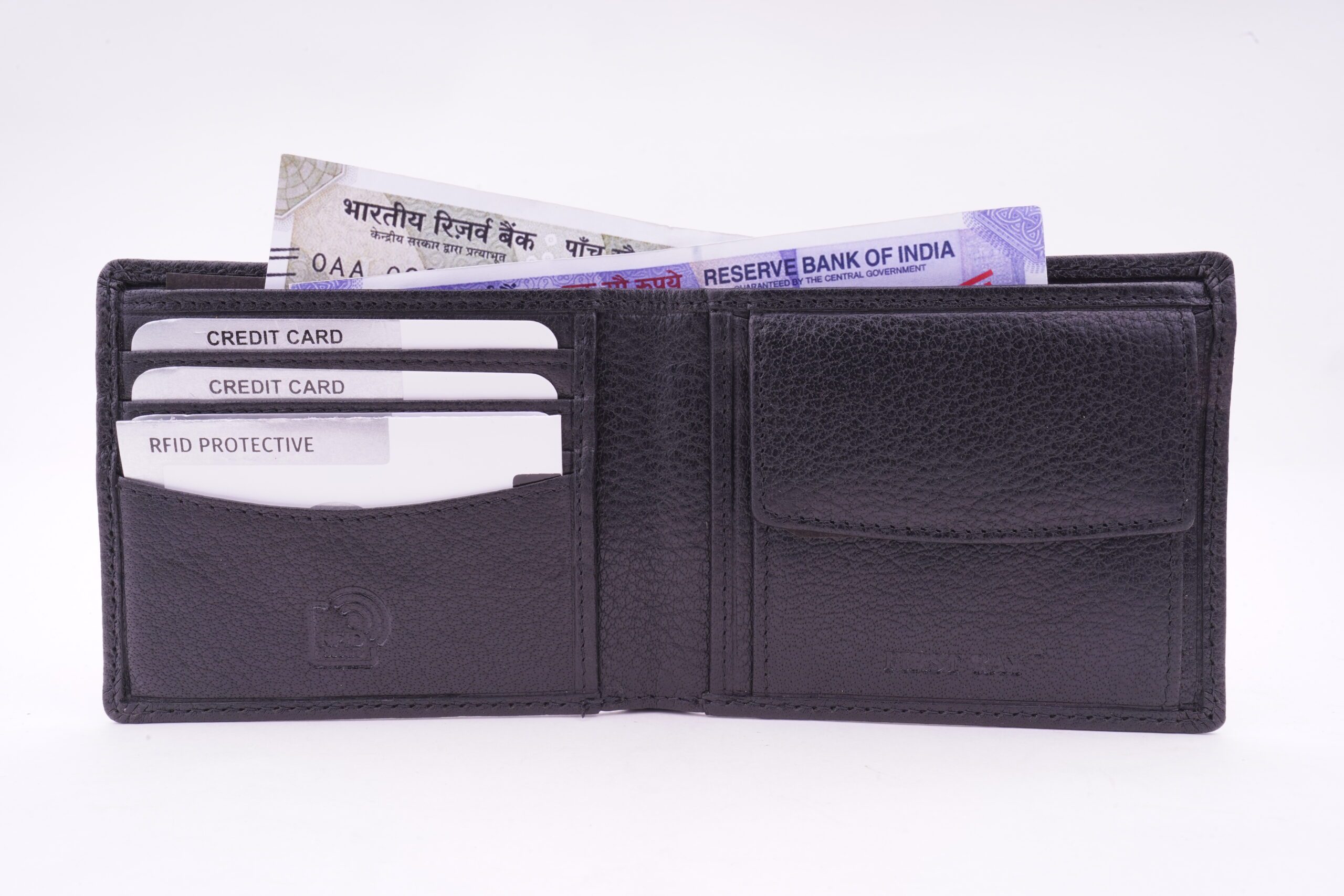 The bi-fold opening wallet features two main note pockets along with one coin pocket. it has one big window where one can put their id and it also has 7 credit card compartments along with two slip pockets inside.